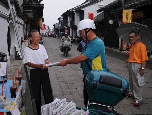 王曉豐在沙溪古鎮投遞報刊。
