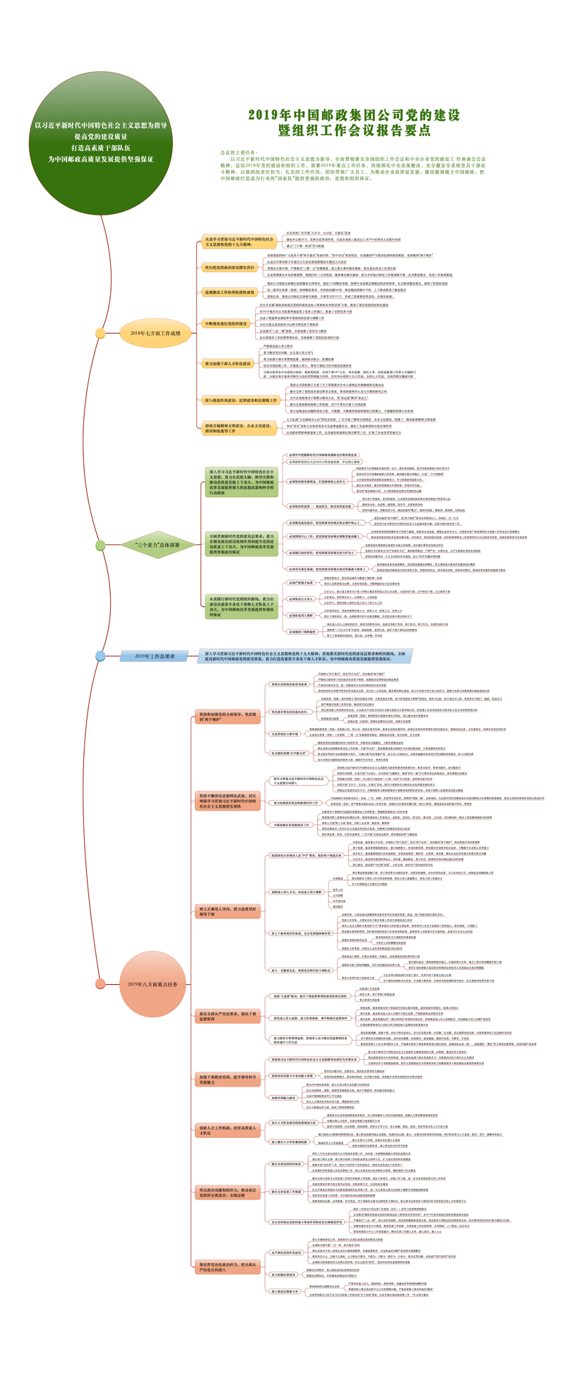會(huì)議從七個(gè)方面總結(jié)了2018年郵政系統(tǒng)黨的建設(shè)和組織工作所取得的成績(jī):認(rèn)真學(xué)習(xí)貫徹習(xí)近平新時(shí)代中國(guó)特色社會(huì)主義思想和黨的十九大精神;突出把黨的政治建設(shè)擺在首位;巡視整改工作取得階段性成效;不斷強(qiáng)化基層黨組織建設(shè);著力加強(qiáng)干部人才隊(duì)伍建設(shè);深入推進(jìn)作風(fēng)建設(shè)、紀(jì)律建設(shè)和反腐敗工作;持續(xù)開展精神文明建設(shè)、企業(yè)文化建設(shè)、群團(tuán)和統(tǒng)戰(zhàn)等工作。