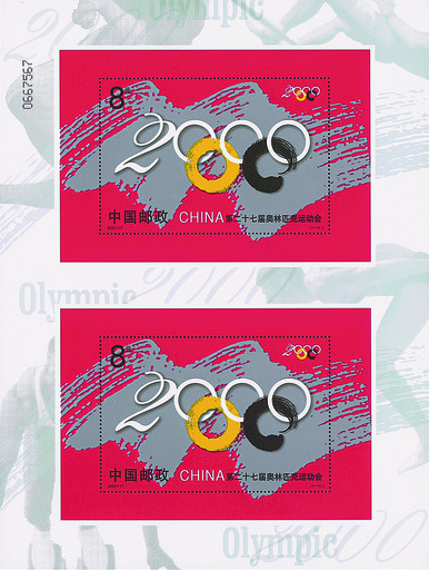 第27屆奧林匹克運動會于2000年9月15日~10月1日在澳大利亞悉尼舉行。中國共奪得28枚金牌,名列參賽國第三名,成為中國邁向世界體育強國征程中的一座里程碑。當年9月15日中國郵政發行《第二十七屆奧林匹克運動會》紀念郵票小型張1枚,圖案為藝術化的奧運旗幟,五環與“2000”巧妙組合,同時還首次發行了小型張雙連張。