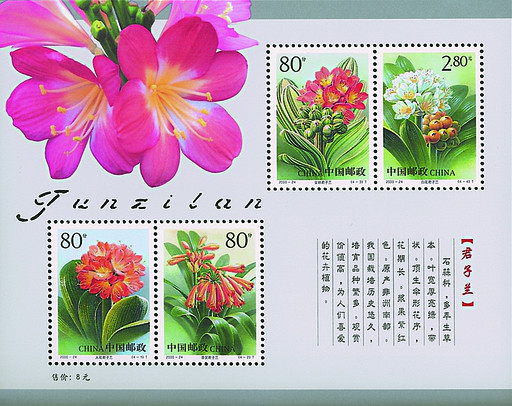 2000年12月12日,《君子蘭》特種郵票面世,小全張圖案為在淺灰色底襯托下,美麗的君子蘭栩栩如生,花的下方是一排精美的拼音文字鏤空設計,這種在版面上的鏤空設計在國內尚屬首次。