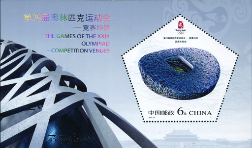 王虎鳴設(shè)計的作品《第29屆奧林匹克運動會——競賽場館》紀念郵票小型張。