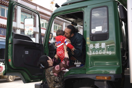 中國郵政甘孜縣分公司郵運駕駛組組長其美多吉依舊駕駛著郵車,往返在甘孜縣與德格縣之間。這段路程是四川省甘孜州綿延5866公里、平均海拔超過3500米的雪線郵路最危險的一段。而其美多吉,是這條郵路上堅守了29年的“航標”。圖為出發前,澤仁曲西將孫子舉到丈夫其美多吉跟前,讓祖孫倆告別。