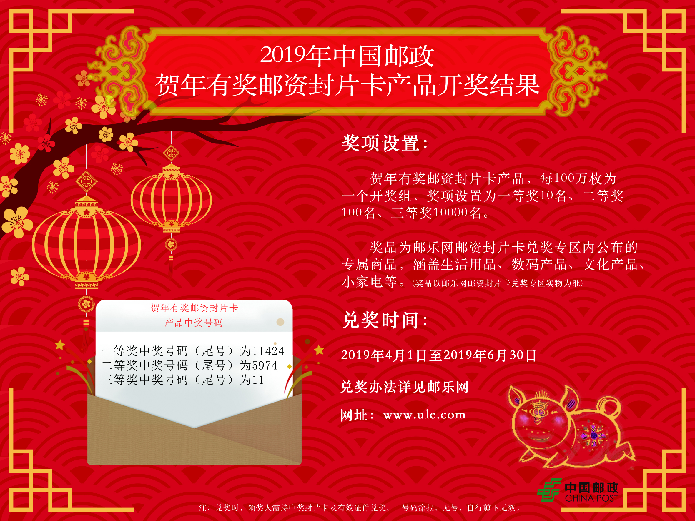 賀年有獎郵資封片卡產品,每100萬枚為一個開獎組,獎項設置為一等獎10名、二等獎100名、三等獎10000名。