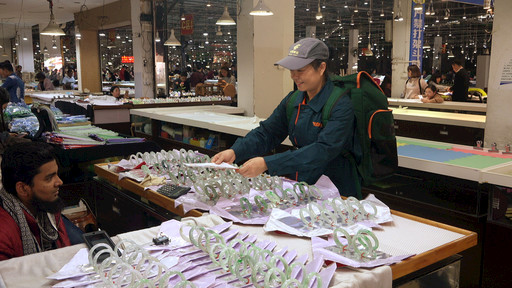 在中國重要的玉石集散中心——云南省德宏傣族景頗族自治州瑞麗市,來自四面八方的人們在各大玉石交易市場淘寶。市場里,有一抹流動的“郵政綠”,始終如一地為玉石珠寶寄遞保駕護航。