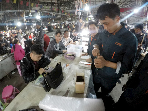 晚上10點,記者走進瑞麗市的姐告玉城夜市,這里燈火通明、人聲鼎沸,2500多個攤位前擠滿了全國各地慕名而來的玉石交易商、文玩收藏家及游客。不同店鋪、攤位前,主播們對著手機、打著手電,正忙碌地展示貨品,旁邊簇擁著等待出貨的商家,很多都是緬甸籍商人。直播中如有客戶線上下單,主播便快速將手中展示的貨品裝袋,用記號筆標(biāo)注,再進行下一件貨品展示,最后,通過快遞將銷售的貨品寄出。