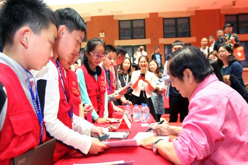 5月10日,“與藝術大師面對面”韓美林上海郵迷見面會在上海市郵政分公司郵政大樓中庭舉行。見面會上,韓美林講述了自己的“郵票情緣”,并為從四面八方趕來的各個年齡段的郵迷在己亥年生肖郵品和集郵文化叢書《美林郵緣》上簽名,還特地為多位“資深郵迷”手繪生肖豬。一位排了3小時隊拿到大師簽名的年輕郵迷激動地說:“我特地連夜從杭州乘火車趕來,能夠一睹大師風采,覺得特值。”圖為韓美林為慕名前來的《小主人報》的小記者們簽名。 □上海記者 周煉 攝影報道