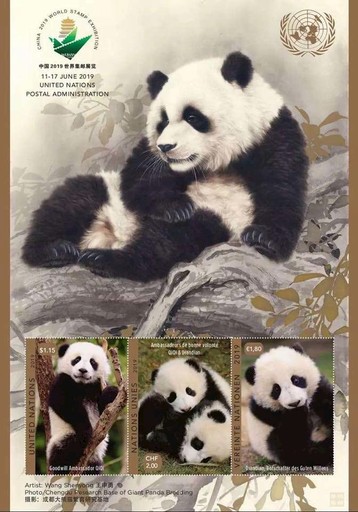 聯合國郵政發行了以“聯合國開發計劃署全球首對動物大使”成都大熊貓基地的雙胞胎“啟啟”和“點點”為主角的小全張(圖1)。