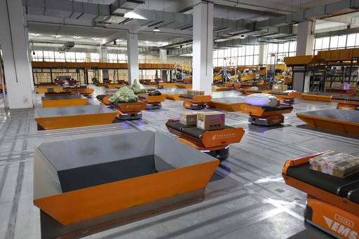 運轉中的郵政AGV搬運機器人。