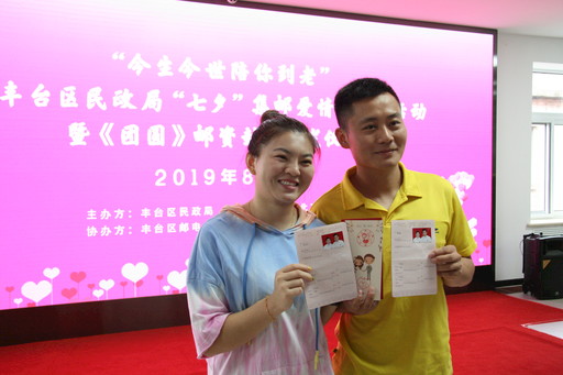 當(dāng)天,豐臺(tái)區(qū)民政局與豐臺(tái)區(qū)郵政分公司聯(lián)合制作、特別推出了“今生今世陪你到老”紀(jì)念郵折,并首發(fā)一套主題為“十全十美”寓意的紀(jì)念郵戳,涵蓋“陪你到老”“愛由心生”“天作之合”“天長(zhǎng)地久”“今生今世”“永結(jié)同心”“愛你一生”“情投意合”“相親相愛”“長(zhǎng)相廝守”10個(gè)美好祝福詞。凡是當(dāng)日到豐臺(tái)區(qū)民政局婚姻登記處領(lǐng)取結(jié)婚證的新人,都可以免費(fèi)獲贈(zèng)紀(jì)念郵折一套,并加蓋任意紀(jì)念郵戳。“七夕是我國(guó)紀(jì)念愛情的傳統(tǒng)節(jié)日,選擇這一天領(lǐng)證對(duì)我們來說有著特殊的含義。我一直很羨慕父母輩的愛情,選一人伴一生,所以,這次我和他選擇了‘陪你到老’這枚郵戳,希望我們能白頭偕老?!碧锱空f。