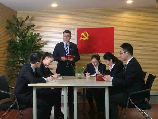 北京分行機關黨支部書記皮震環(huán)(左三)結合黨的十九大精神為黨員講黨課。