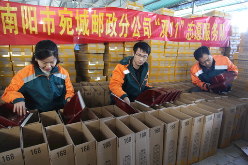 11月11日上午,河南省南陽市宛城區郵政分公司組織黨員突擊隊深入電商園區,為大客戶提供包裝、收寄、運輸等服務,進一步提升客戶體驗。 □劉力揚 攝影報道