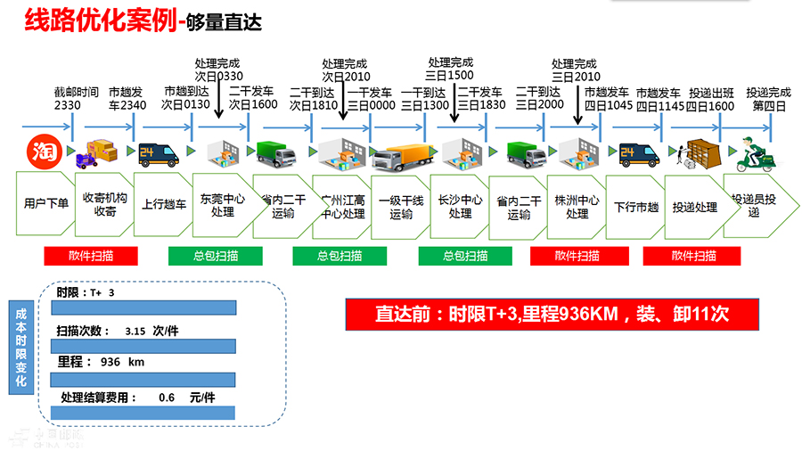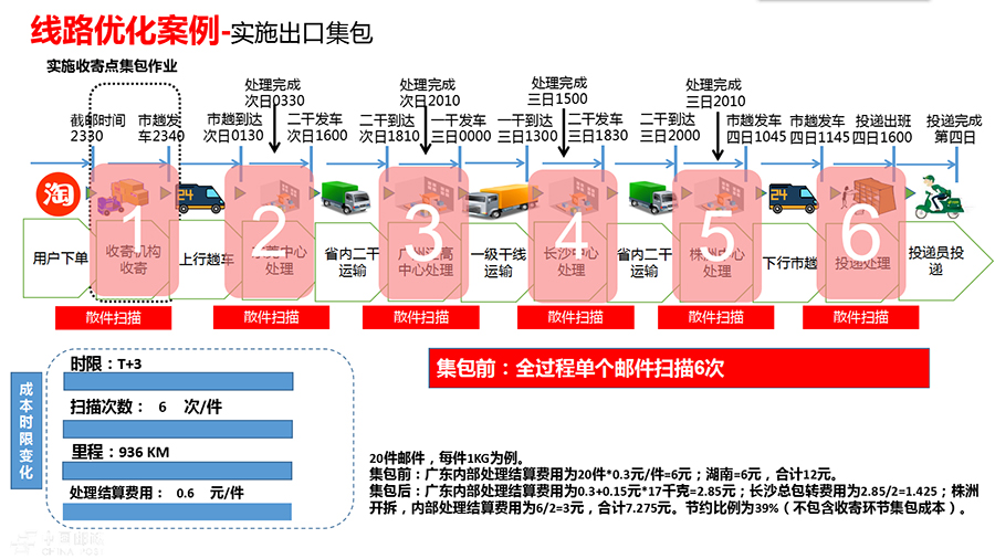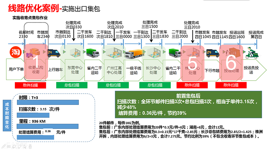 郵路要怎么捋?就是要以和競爭對(duì)手對(duì)標(biāo)為任務(wù),對(duì)每條線路從收寄到投遞進(jìn)行全環(huán)節(jié)梳理、全鏈路優(yōu)化。以廣東東莞—湖南株洲線路為例:這條線路目前日均包件量1000件,在全散件模式下,由于沒有直達(dá)郵路,郵件從收寄到投遞,每個(gè)郵件全程需經(jīng)過6次散件分揀,11次散件裝卸搬運(yùn),時(shí)限T+3。通過全環(huán)節(jié)捋、全流程捋、各環(huán)節(jié)優(yōu)化,改為在東莞實(shí)施前置集包,散件在收寄網(wǎng)點(diǎn)直接分揀封入株洲總包,同時(shí)開通東莞—株洲直達(dá)郵路,郵件由原來在東莞—廣州—長沙—株洲間散件裝卸,優(yōu)化為東莞—株洲總包裝卸。通過這兩種優(yōu)化措施的結(jié)合,郵件由散件分揀6次、裝卸搬運(yùn)11次,將變?yōu)樯⒓謷?次、總包分撥3次、裝卸搬運(yùn)7次,減少了廣州和長沙的4次總包裝卸作業(yè),處理結(jié)算費(fèi)用降低39%,裝卸效率大幅提升;時(shí)限水平由T+3將減少為T+1,達(dá)到次日遞,超過主要競爭對(duì)手;全程運(yùn)輸里程從936公里將縮短為720公里,減少了23%,節(jié)約了運(yùn)輸成本。此外,在該線路日均郵件量較少的情況下,可以采取組開深圳—東莞—株洲串行直達(dá)的運(yùn)輸方式,在提高車輛裝載率的同時(shí),實(shí)現(xiàn)當(dāng)天收寄的東莞—株洲郵件和18點(diǎn)前收寄的深圳—株洲郵件全程時(shí)限T+1。