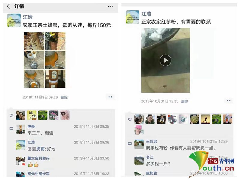 全縣23個(gè)鄉(xiāng)鎮(zhèn)的土豬、土雞、蜂蜜、葛根粉、干菜等土特產(chǎn)在他的朋友圈“輪番出售”。“農(nóng)家正宗土蜂蜜,預(yù)購(gòu)從速,每斤150元。”今年“雙11”之前,江浩在朋友圈“賣(mài)貨”,不一會(huì)兒便有買(mǎi)家留言,“來(lái)二斤,謝謝!”