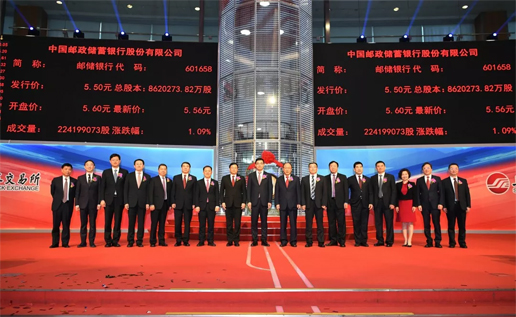 今日,中國郵政儲蓄銀行又迎來改革發展史上一個重要的里程碑,中國郵政儲蓄銀行A股股票(證券簡稱“郵儲銀行”,證券代碼“601658”)正式在上海證券交易所上市,標志著國有大型商業銀行“A+H”兩地上市完成收官。據悉,郵儲銀行此次A股發行價格為5.50元/股,“綠鞋”前募資金額為284.5億元,“綠鞋”后預計為327.1億元。