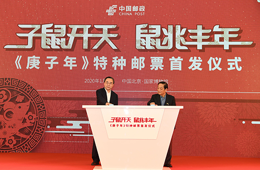 1月5日,《庚子年》特種郵票首發(fā)儀式在中國(guó)國(guó)家博物館舉行。該套郵票設(shè)計(jì)者、著名藝術(shù)家韓美林,中國(guó)郵政集團(tuán)有限公司董事長(zhǎng)劉愛力、國(guó)家博物館館長(zhǎng)王春法等出席儀式。劉愛力與韓美林共同為《庚子年》特種郵票揭幕。