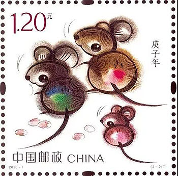 庚子鼠年生肖郵票第一圖名為“子鼠開天”,取自民間傳說(shuō)“鼠咬天開”,萌動(dòng)之鼠騰空躍起,咬破混沌,遂成宇宙,寓意國(guó)家取得了開天辟地、繼往開來(lái)的巨大成就;第二圖為“鼠兆豐年”,三只小鼠一副歡喜自得模樣,寓意闔家歡樂(lè),花生圖案一派豐收景象,寓意2020年五谷豐登、闔家歡樂(lè)。畫面運(yùn)用裝飾小寫意的畫法,結(jié)合傳統(tǒng)國(guó)畫的渲染技藝,展現(xiàn)了生肖鼠的可愛萌動(dòng),預(yù)示著偉大祖國(guó)的繁榮富強(qiáng)。