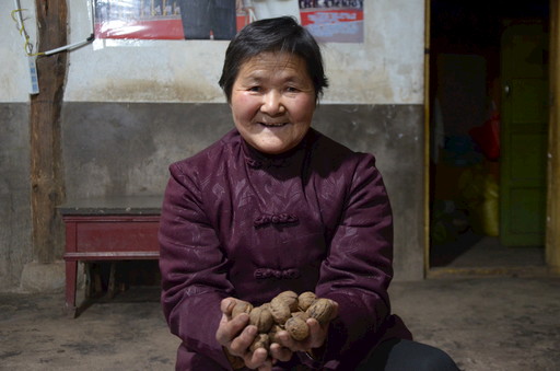 耿淑娥熱情地請記者吃她種的核桃。 記者 呂磊 攝