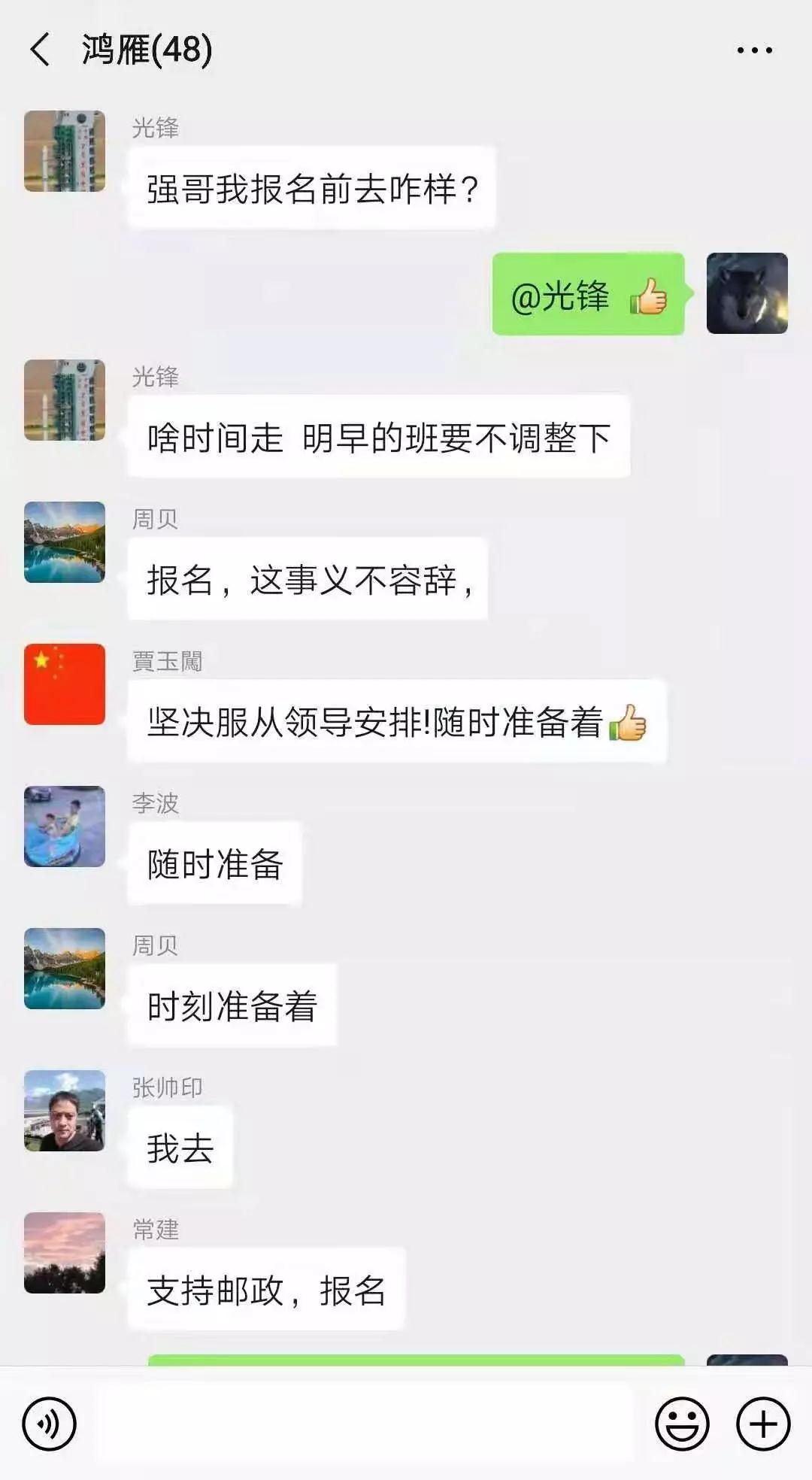 “堅決服從安排!隨時準備著”“報名,這事義不容辭”“堅決支持,我報名”……1月26日,在南陽市分公司網運條線微信群里,當得知需要兩名同志去武漢運送防疫物資時,許多人紛紛踴躍報名,請戰前線,表示要以自己的實際行動為抗擊疫情貢獻力量。