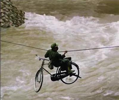 在山溝溝里蹬著車,在小河里劃著船
