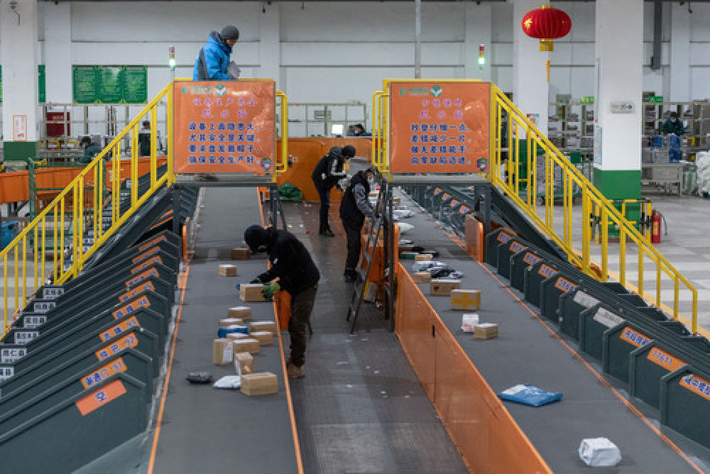 記者在現場看到,數名戴著口罩的工作人員正在郵件分揀輔助設備上緊張工作,傳送帶上的郵件包裹經辨認后會被放置于不同目的地的小隔欄中,央珍的就業(yè)材料也將在此被分揀后運送到目的地。
