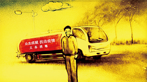 記者又問陳娜,知道他給消毒車隊捐了20桶消毒液嗎?陳娜搖搖頭說,他不講,但是我支持他。于是,她用自己的一技之長為他畫了一幅沙畫,名字就叫《消毒送安全 郵件送希望》。