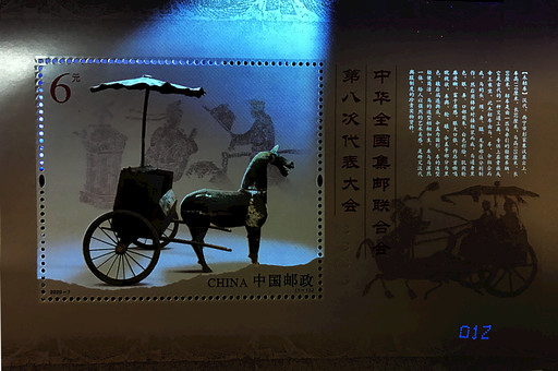 印制后的郵票,不僅在日光下色彩沉穩大氣,文物木軺車和馬匹歷經歲月洗禮的滄桑盡顯,精準還原軺車車型,引發觀者對2000多年前郵運工具的無盡聯想,而且在熒光燈照射下,更加出彩,只見票面上忽有一束光柱自上而下,灑在木軺車上,車身、馬背在燈光籠罩下泛出光芒,車身、馬身下陰影、光圈斑駁相映,背景的漢代古畫忽然與車馬拉開了距離,似一幅壁畫靜立其后,木軺車瞬間從平面變為立體,讓觀者仿佛置身于博物館,在射燈光柱下觀賞真實文物。
