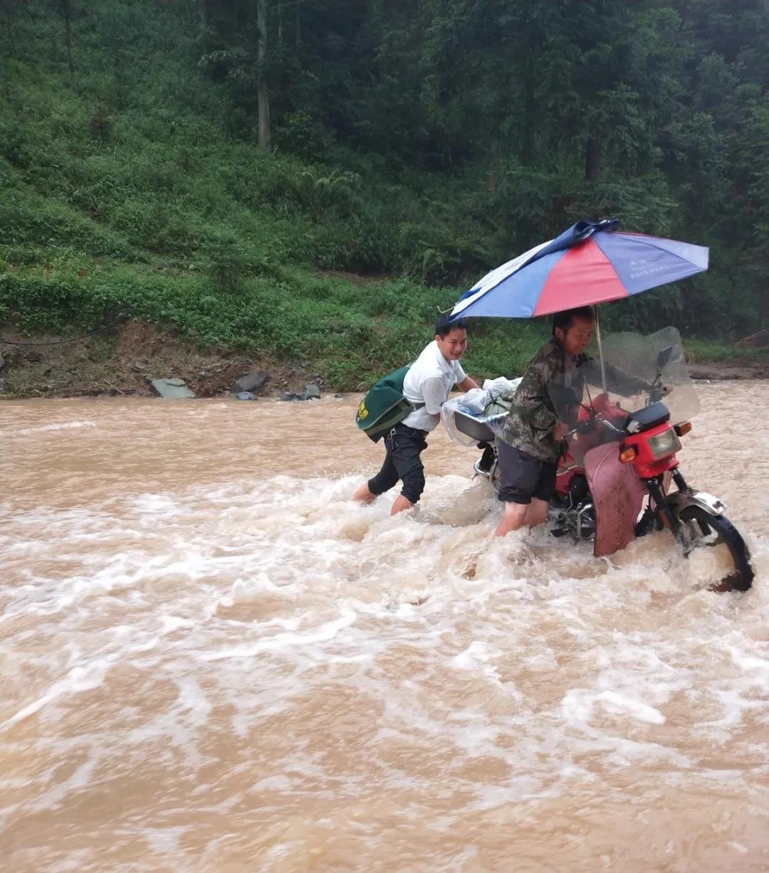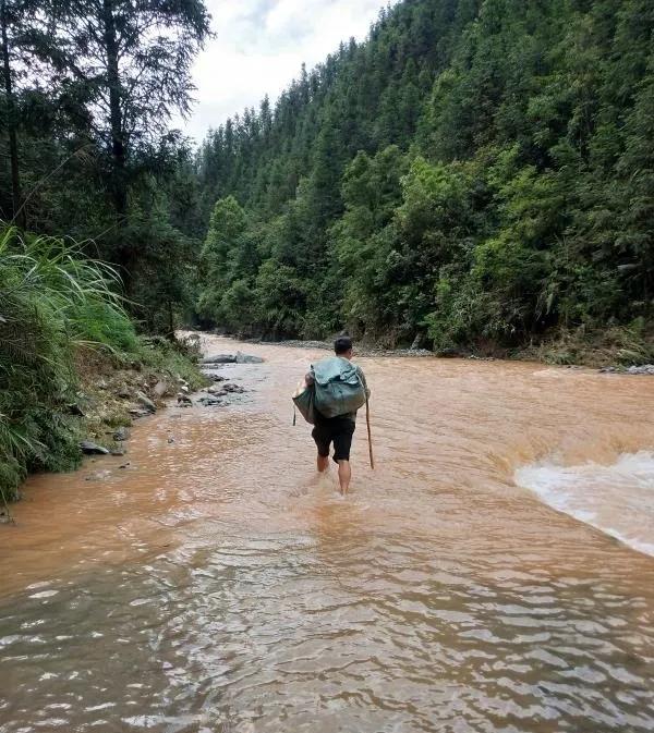 6月11日一早,潘志貴整理好郵件后出發了。當他來到距離友娘村5公里的小河邊時,被洪水擋住了前進的道路,由于水勢過大,車輛沒法通過,于是他停下摩托車,到附近山上找來一根木棍,把郵包挎在自己的肩膀上,一邊手撐木棍一邊在河中試探著移步,之后繼續徒步走向友娘村。