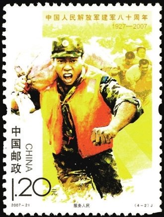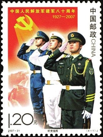 2007年8月1日發行2007-21《中國人民解放軍建軍八十周年》紀念郵票1套4枚,畫面生動表現了中國人民解放軍在黨的領導下,發揚聽黨指揮、服務人民、英勇善戰的優良傳統,刻苦訓練、抗洪搶險,參與聯合國維和行動,用忠誠和熱血捍衛國家主權和安全,筑起共和國的鋼鐵長城,集中反映出軍隊建設的新成就和我軍忠實履行歷史使命的時代風采。