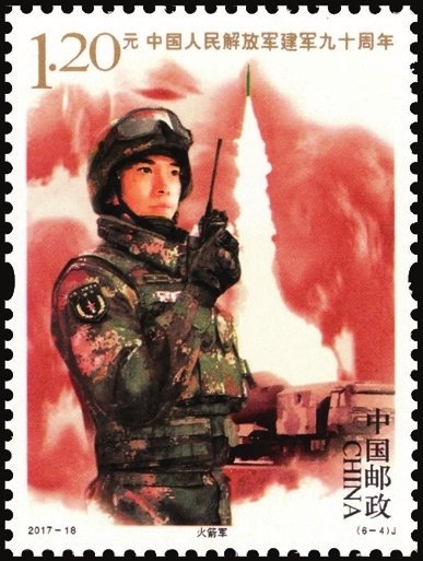 2017年8月1日中國郵政發行了2017-18《中國人民解放軍建軍九十周年》紀念郵票1套6枚,小型張1枚。圖案內容分別為:陸軍、海軍、空軍、火箭軍、戰略支援部隊、武裝警察部隊,小型張內容為聽黨指揮。該套郵票展現了中國人民解放軍的颯爽英姿和中國軍事作戰裝備的硬件實力,主題鮮明,磅礴大氣,畫面具有強烈的動感和威嚴的氣勢。小型張上軍旗飄揚,各軍種英姿颯爽,背景襯托各軍種高尖端裝備,描繪了我軍戰士聯合作戰的畫面,既表現了中國人民解放軍威武雄壯的軍容和現代化水平,也體現出黨的十八大以來,人民軍隊在新時代強軍目標指引下所取得的巨大成就。