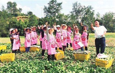 張武和菜農們一起,在菜地里上演一場時尚大氣的圍裙秀。□黃倩 攝