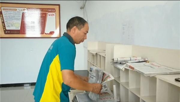 在獅豹頭鄉(xiāng)郵政支局的一間大屋子里,報刊、信件的分揀對閆見海來說輕車熟路?!胺謷罂耐瑫r,我就把報紙翻看完了,路上遇到村民會問我,‘今天有啥新聞’,我就說給他們聽?!遍Z見海笑著,將報刊分裝進一個褡褳樣的郵包里,斜挎在肩上。