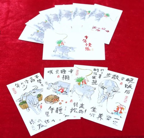 《牛年快樂》普通明信片的郵資圖選取了第二輪生肖牛郵票剪紙?jiān)髡啐R秀花的作品,由王虎鳴設(shè)計(jì),畫面中的牛昂首向上、充滿力量。兩套明信片分別采用水彩繪畫及水墨手繪形式,畫面溫暖充滿童趣,展現(xiàn)出濃厚的春節(jié)民俗特色,分別由景紹宗及段雅婕、潘振磊設(shè)計(jì)。《辛丑吉祥》極限明信片由韓美林先生設(shè)計(jì)指導(dǎo),明信片正面左下角圖案及背面圖案與郵資圖相同,形成極限概念,四枚明信片廣告面可組成完整的“恭賀新春”吉祥短語(yǔ)。祝福卡《牛年如意》《新春送福》,畫面以健碩而充滿活力的牛為主要形象,傳遞國(guó)裕民康的良好祝愿,分別由張旺、武世寧設(shè)計(jì)。2021年賀年專用郵票分別為《國(guó)裕家康》《新春送福》,兩套郵票構(gòu)成的小全張,以紅色、金色為主體色調(diào),將“福”字、甲骨文的“門”字及中國(guó)書畫中的斗方元素進(jìn)行組合設(shè)計(jì),寓意歲月更新福滿門、開門見福迎新春。《國(guó)裕家康》由韓美林設(shè)計(jì),《新春送福》由陳楠設(shè)計(jì)。相關(guān)產(chǎn)品自11月5日起在全國(guó)郵政網(wǎng)點(diǎn)銷售,廣大用戶可在郵政網(wǎng)點(diǎn)和中國(guó)郵政微商城明信片專區(qū)選購(gòu)。