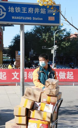 在王府井食品商場鱗次櫛比的商戶中間,譚海波拉著一輛折疊平板車,逐個鋪位“掃貨”——將商戶們封好的包裹整齊地碼放裝車。不到30分鐘,他已經(jīng)攬收了50多件包裹,這些包裹有的是游客們來京旅游的紀念品,有的是網(wǎng)友們“雙11”瘋狂購物的“戰(zhàn)利品”。在接下來的幾小時中,它們將跟隨王府井營業(yè)部的郵車運往全國。