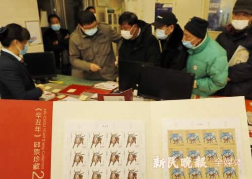 圖為在中國郵政上海金山區(qū)石化郵政支局營業(yè)大廳,集郵愛好者在排隊購買《辛丑年》特種郵票