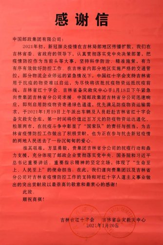 日前,吉林省紅十字會致信中國郵政集團(tuán)有限公司,感謝吉林郵政迅速啟用抗疫物資運(yùn)輸綠色通道,第一時間將吉林省紅十字會價值近百萬元的抗疫物資運(yùn)達(dá)通化、松原兩市,對中國郵政集團(tuán)有限公司和吉林省分公司在吉林省疫情防控工作中給予的支持和為紅十字人道主義事業(yè)作出的突出貢獻(xiàn)致以崇高的敬意和衷心的感謝。