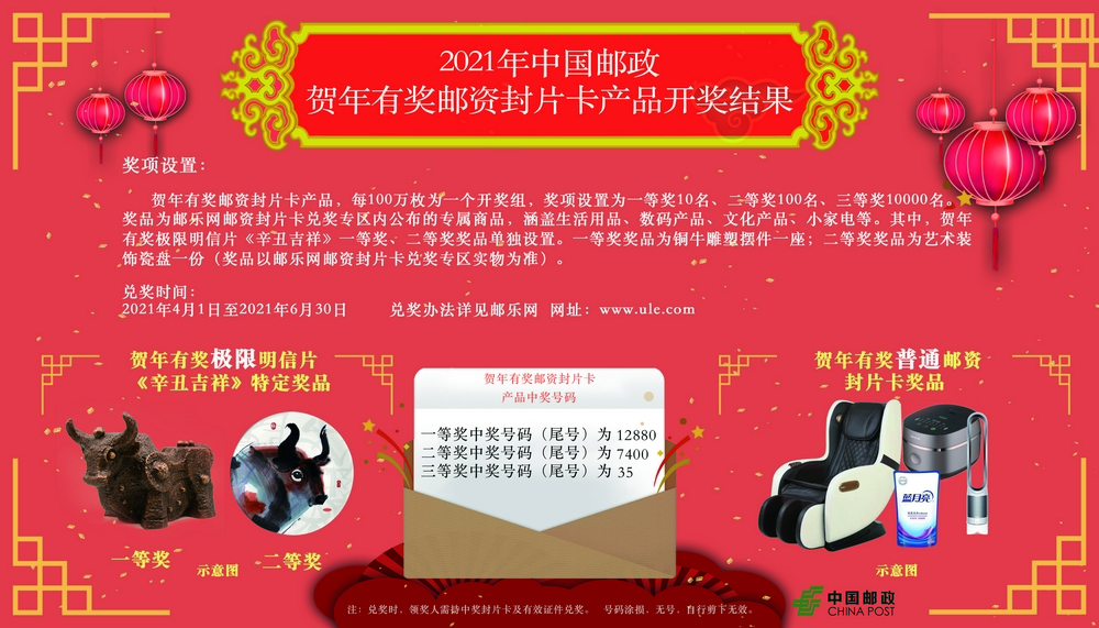 2021年賀年有獎郵資封片卡中獎號碼于3月26日產生?,F將具體中獎信息通知如下: