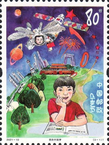 登上《兒童畫作品選》特種郵票的3幅作品“我的中國夢”“國粹之韻”和“希望與夢想”,分別由上海市同濟小學的楊曉芒、合肥新站壽春實驗中學的費玉婷、上海市周浦第三小學的錢昕逸3位小朋友設計。第一枚通過描繪我國航空航天事業、城市、交通網絡繁榮發展等場景,表達了少年兒童不斷追尋探索宇宙的夢想以及對未來美好生活的憧憬;第二枚描繪了傳統文化與城市發展、現代科技共繁榮的場景,表達了少年兒童對中華優秀文化的熱愛與傳承;第三枚描繪了偉大祖國不斷發展的場景,少年兒童登高望遠、憧憬未來。三枚郵票緊密圍繞主題,展現出少年兒童對黨領導下的偉大祖國的無比熱愛、由衷禮贊和美好祝愿。