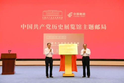 康寧和吳向東(左)為中國共產黨歷史展覽館主題郵局揭牌