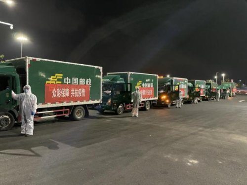 24日晚8點,12輛郵政大貨車先后完成裝貨工作,由12名身穿防護服的郵政駕駛員啟程前往江寧區祿口街道辦事處及下轄幾個社區。