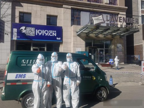 14時36分,郵車到達隔離點——鎮(zhèn)賚縣薰衣草賓館。投遞人員下車后第四次對藥物郵件進行消毒,最終將藥物送到集中隔離點工作人員處,由他們轉(zhuǎn)交到孩子手中。