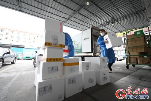 郵政快遞作為民生重點,也在積極參與抗疫保供。4 月 24 日一早,上海市支援物資、市區(qū)醫(yī)院的藥品先后抵達(dá)奉賢區(qū)中轉(zhuǎn)站,郵政工作人員立即進行消殺、并第一時間進行配送。(沈春琛攝 / 光明圖片 / 視覺中國)