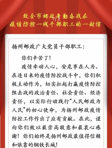 面對(duì)復(fù)雜的疫情防控形勢(shì),揚(yáng)州郵政人堅(jiān)信有省分公司黨委和地方黨委政府的堅(jiān)強(qiáng)領(lǐng)導(dǎo),就一定能夠打贏疫情防控和經(jīng)營(yíng)發(fā)展“雙勝利”。