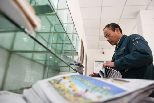 在中國郵政集團公司安徽省巢湖市散兵支局,鄭愛軍分揀報紙(4月30日攝)。
