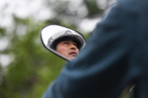 在安徽省巢湖市散兵鎮山口村,鄭愛軍騎行在投遞郵件的路上(4月30日攝)。