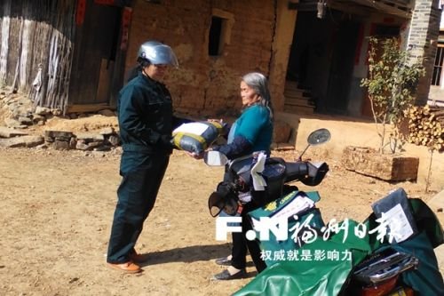 閩清縣上蓮鄉(xiāng)的高山上,一座簡(jiǎn)陋的土墻瓦房前駛來一輛摩托車,身穿綠色工服的女郵遞員支好車,將一個(gè)包裹遞給住在這里的一位老奶奶。包裹里,是老奶奶的晚輩為她網(wǎng)購(gòu)的日用品。