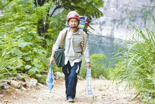 羅運良背負郵件,步行在建陽坪村利方巖橋上。