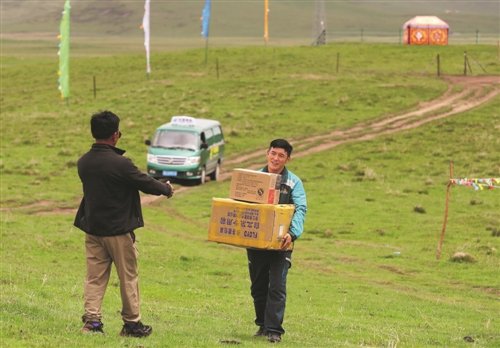 看到郵車來了,牧民迫不及待地迎上去接過自己網購的商品?!酢豆と巳請蟆酚浾?王偉偉 攝