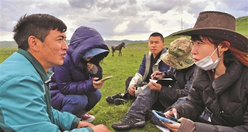 投遞間隙,哈弄奪機在草原上席地而坐,接受記者聯訪。□中國郵政報記者 張晨昱 攝