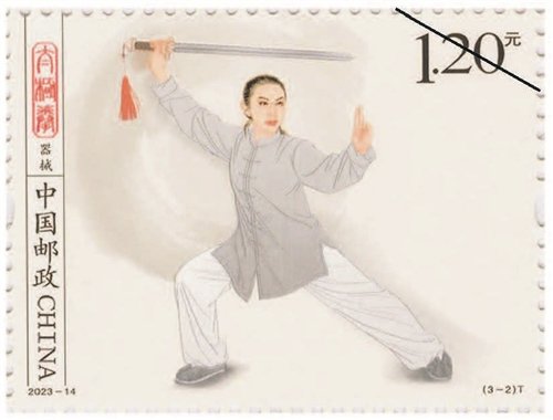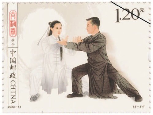 該套郵票一套3枚,圖案內(nèi)容分別為拳術(shù)、器械、推手。郵票采用工筆人物形式表現(xiàn),整體色調(diào)以黑白灰為主,背景采用水墨飛白映襯太極拳平和、包容、大道至簡(jiǎn)的意境。第一枚郵票表現(xiàn)了一位白發(fā)長(zhǎng)須老者,正氣定神閑地做著太極拳單鞭動(dòng)作,體現(xiàn)出太極拳的傳統(tǒng)風(fēng)范和延年益壽的作用。背景用揮灑自如的水墨筆觸和肌理來(lái)表現(xiàn),伴隨老者動(dòng)作產(chǎn)生無(wú)形氣韻。第二枚郵票中是一位英姿颯爽的舞劍女子,背景中如影隨形的氣流若隱若現(xiàn),體現(xiàn)出太極劍行云流水的特點(diǎn)。第三枚郵票中是一對(duì)進(jìn)行太極拳推手的男女青年,一男一女、一黑一白象征太極的陰陽(yáng)相濟(jì),背后的水墨肌理隱約形成陰陽(yáng)的概念,刻畫(huà)出“陰陽(yáng)太極本相隨、動(dòng)靜虛實(shí)把手推”的場(chǎng)景。