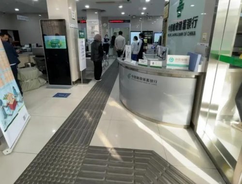 除了手語服務,初次踏入香山支行的客戶或許還會發現,行內有一條灰色的盲道,從柜臺服務窗口延伸,直達主要街道。